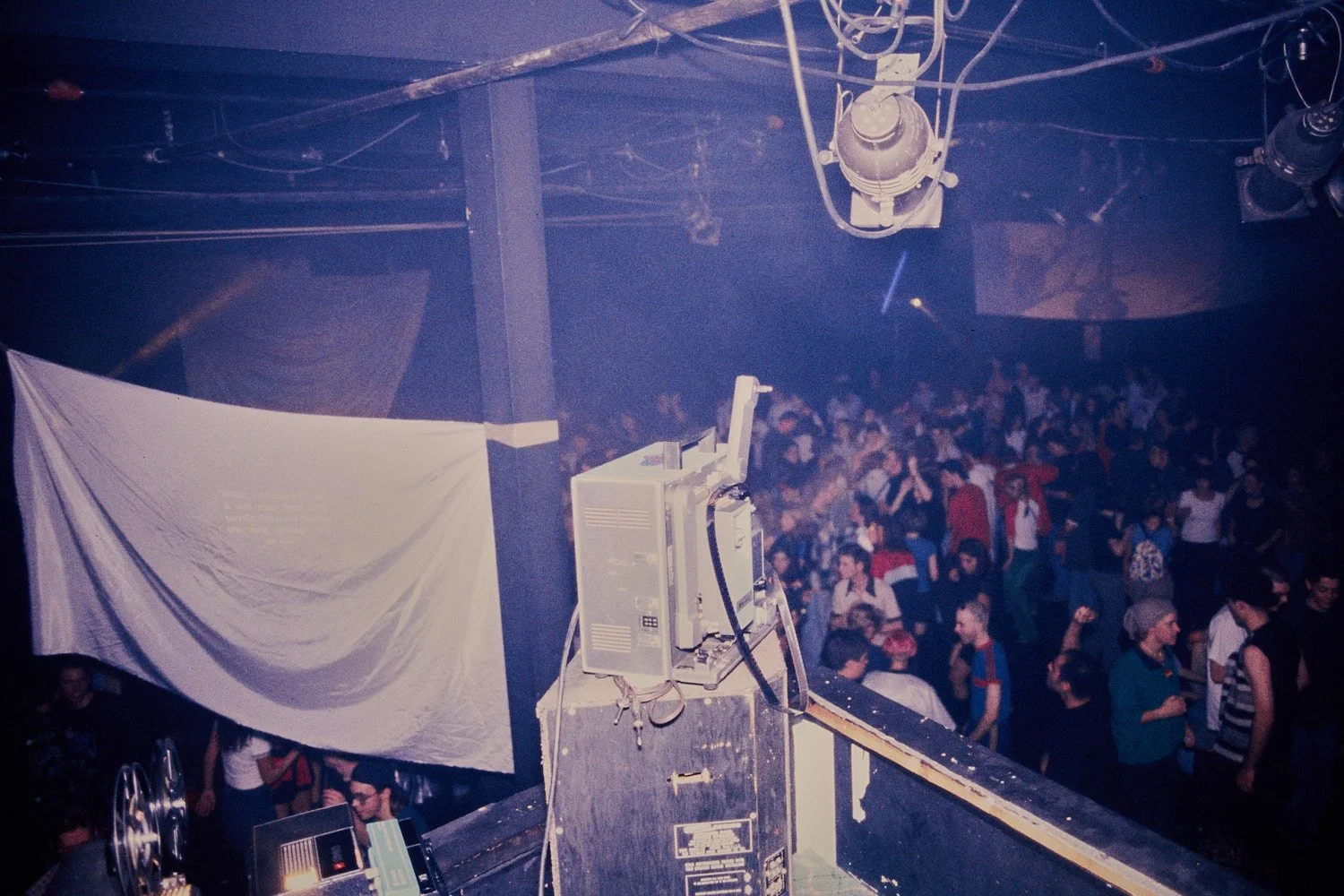1995/1996 - By projecting photos and film loops on the walls, ceilings, and backdrops for Raves and musical events I would design and create the visual atmospheres. At this time the projections were entirely analogue, using old slide projectors, 8mm and 16mm film projectors that I found in local thrift shops. Much of the imagery was garnered from old movie footage or rephotographed from books and magazines. Film loops are the original GIFs. They are hand-made by piecing together sections of celluloid film, looped into a circle and secured together with tape. They play a short vignette, spinning through a 16mm film projector, repeating roughly every 4 to 8 seconds, all depending of the length of the loop (usually around 1 to 2 metres in circumference).